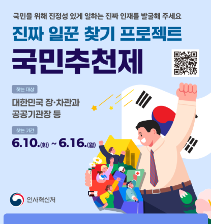 지금 이 글을 읽고 있는 여러분이 바로, 진짜 일꾼을 발굴할 수 있는 국민 심사관입니다. 단 한 번의 추천이 공정하고 투명한 인사의 씨앗이 됩니다. 대한민국을 위해, 한 사람을 위한 클릭, 지금 바로 실천해보세요.